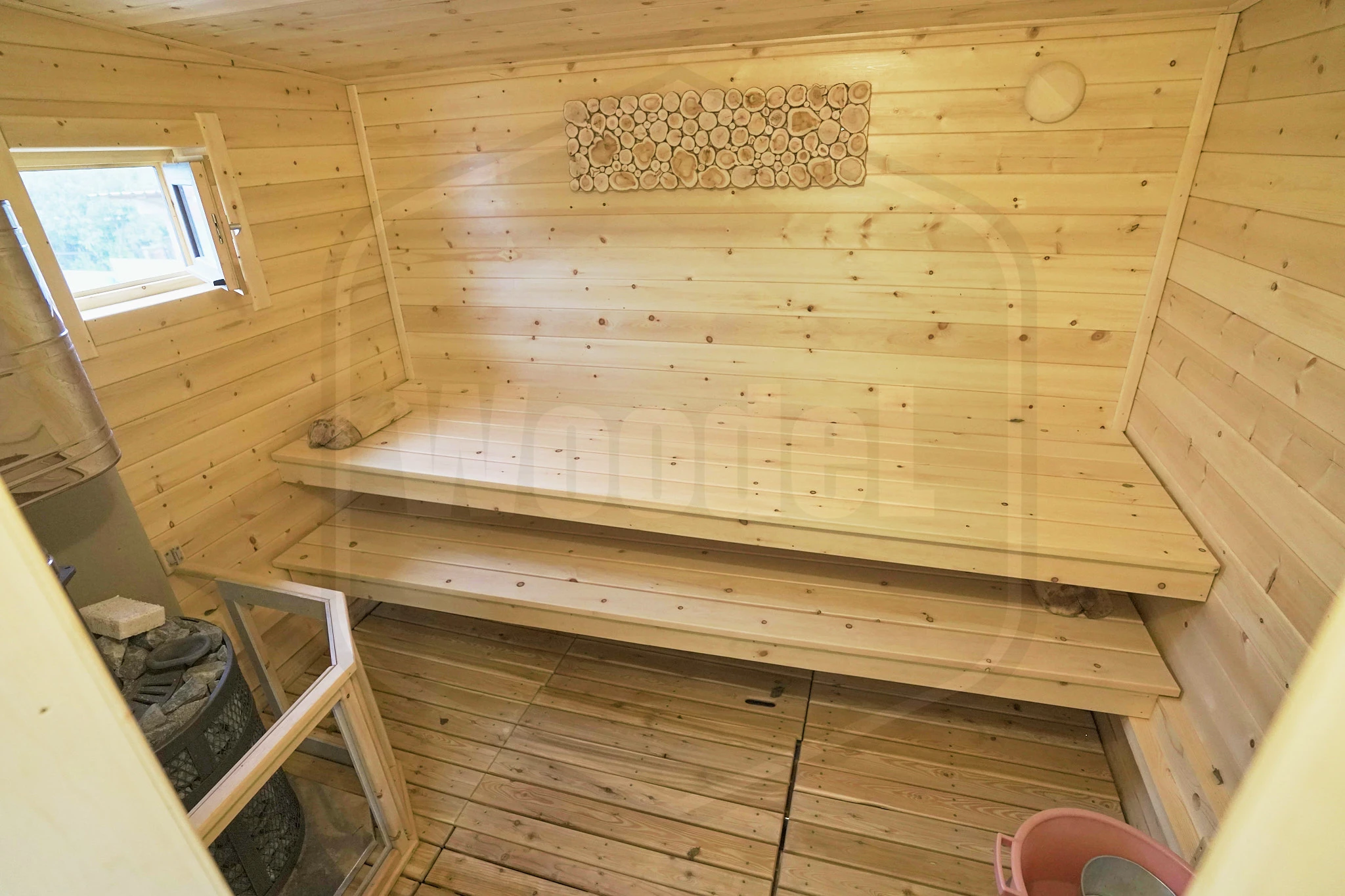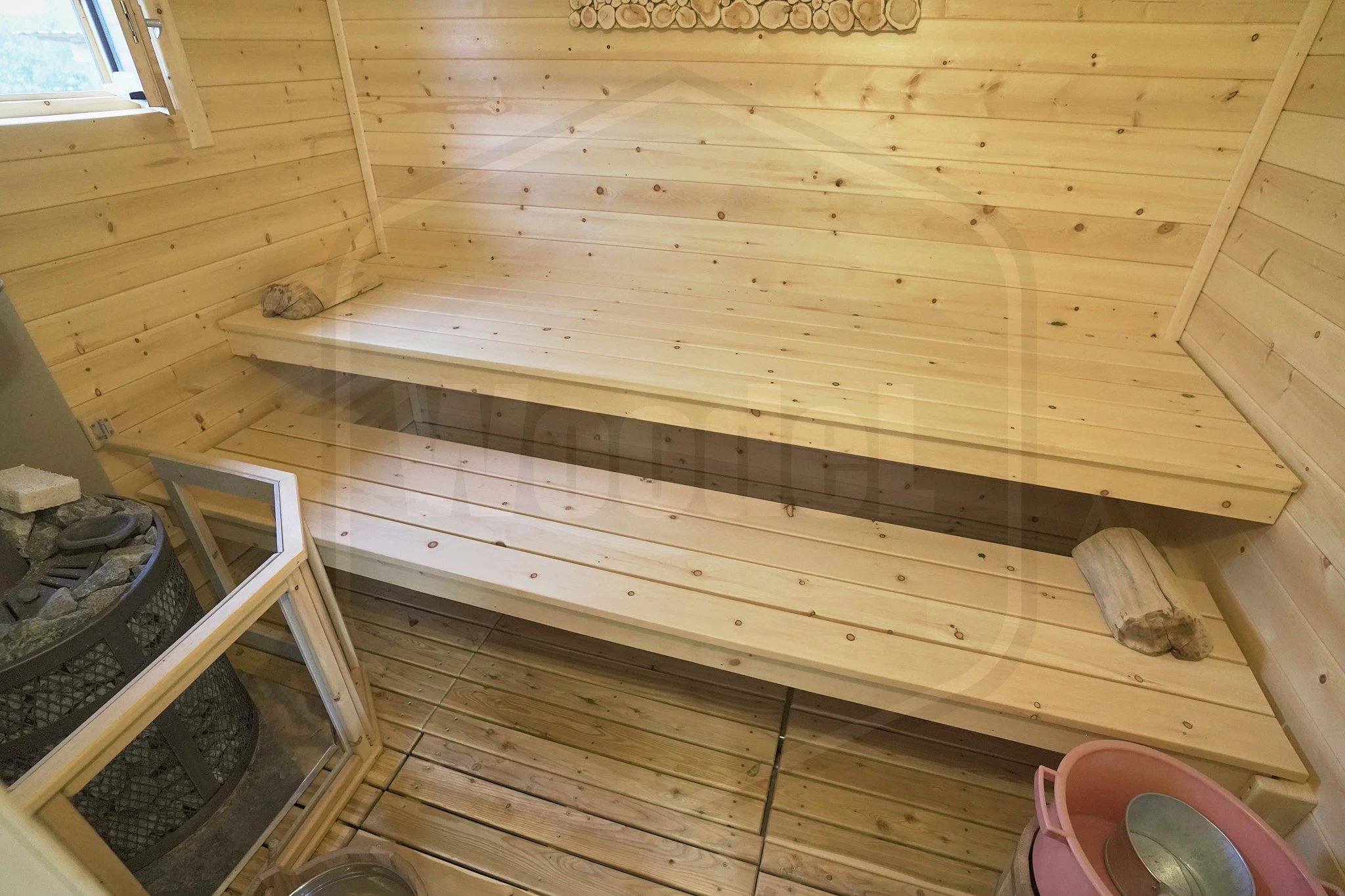 3. Парная с панорамным окном. Это визитная карточка серии HEAT! Большое панорамное окно стирает грань между уютным теплом парной и красотой вашего участка. Вы паритесь, наслаждаясь видом на природу, а не на глухую стену. Двухуровневые полки из липы или ольхи позволяют выбрать оптимальную температуру, а мощная печь создает тот самый “легкий пар”.