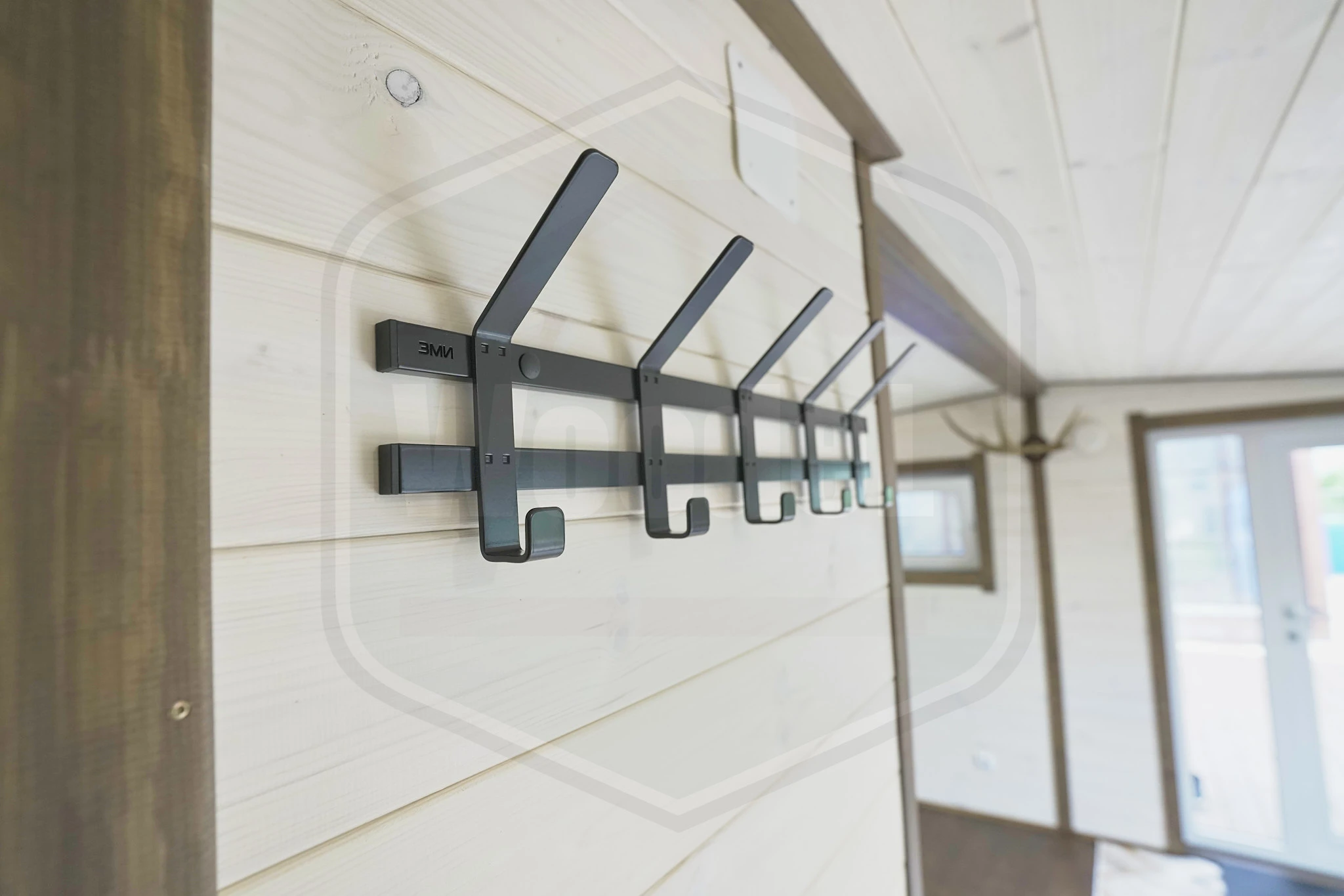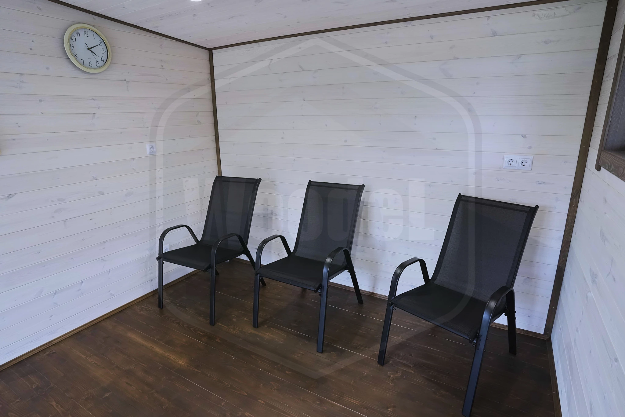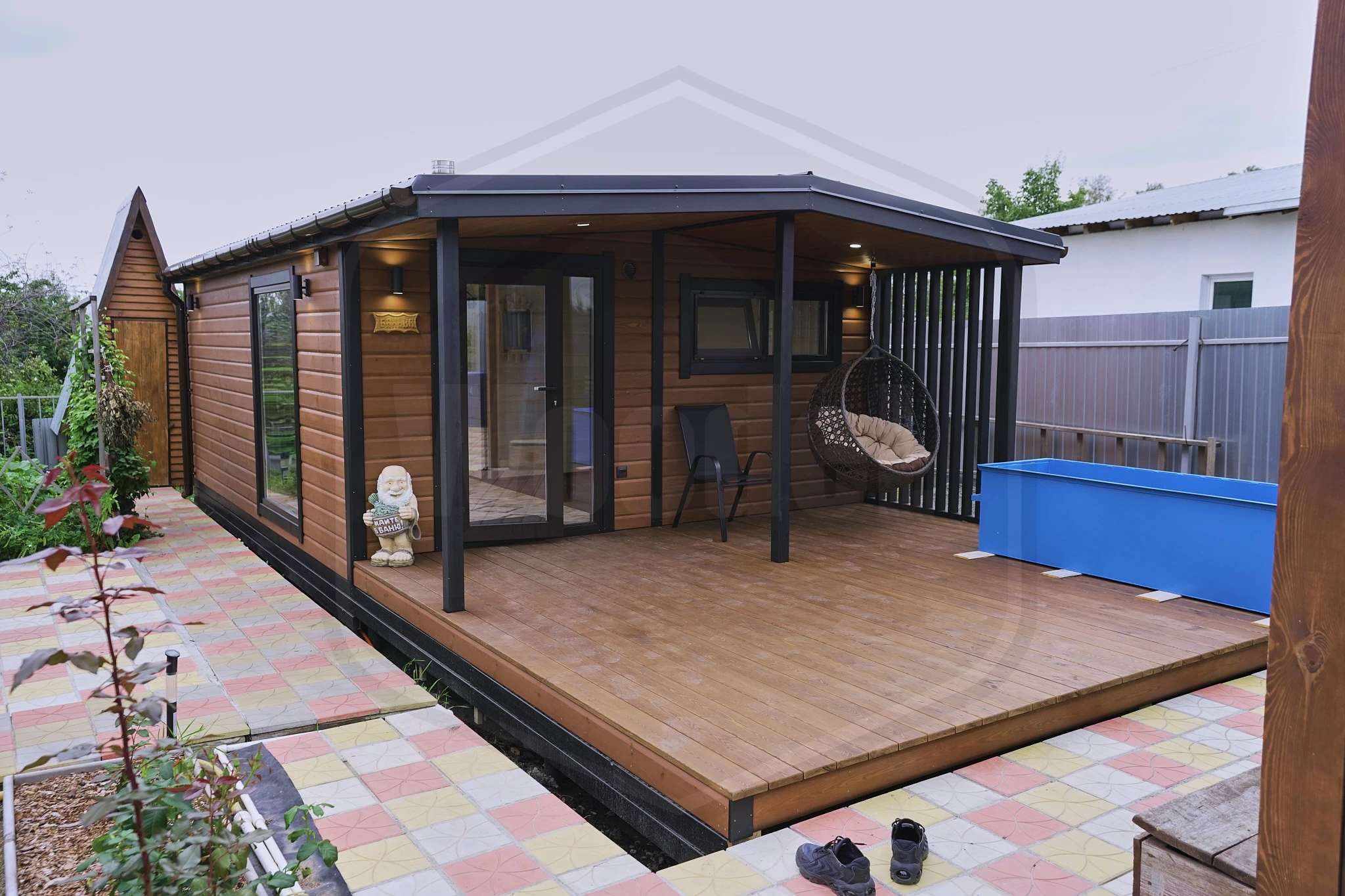 1. Просторная крытая терраса. Это не просто крыльцо, а полноценная лаунж-зона площадью 9 м². Здесь можно поставить уютные кресла или небольшой стол. Представьте: после жаркой парной вы выходите на свежий воздух с чашкой травяного чая, любуетесь своим садом и отдыхаете под защитой от солнца или дождя.