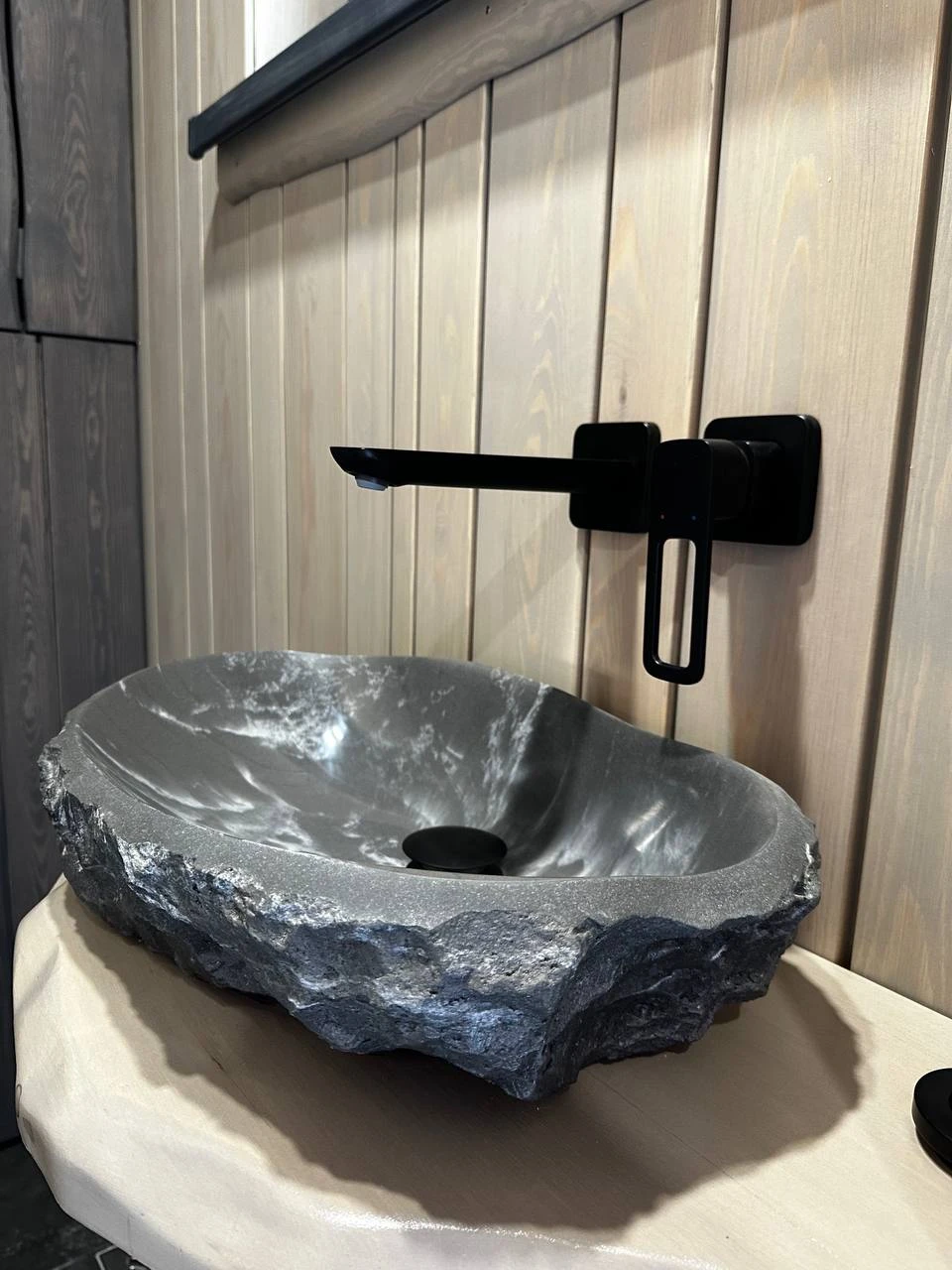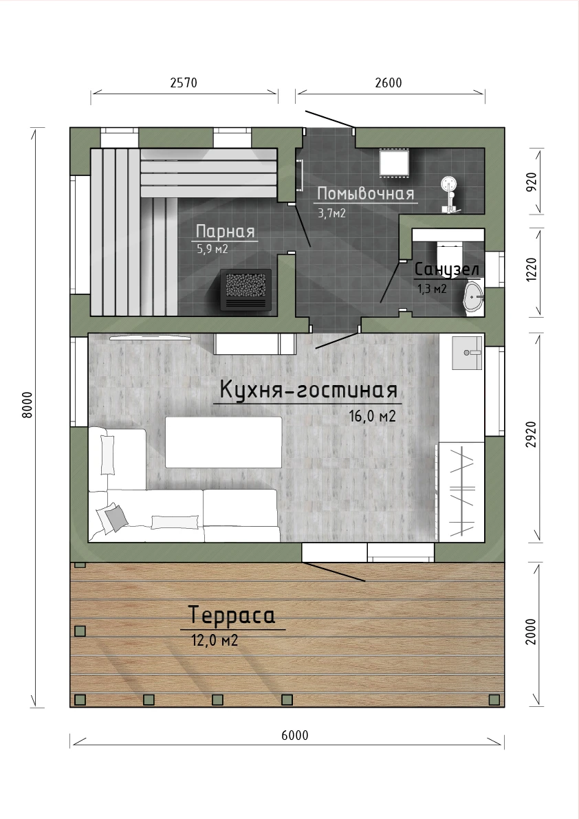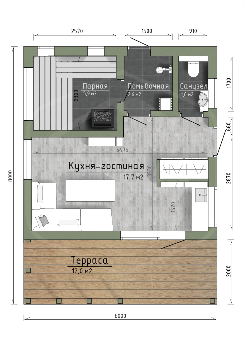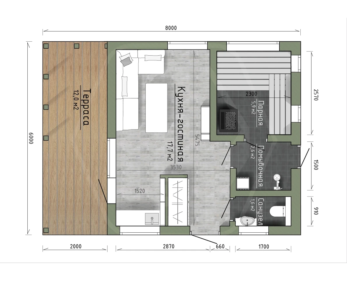 - Помывочная: Отделка стен — влагостойкие панели/плитка, пол — террасная доска из лиственницы со сливным трапом.