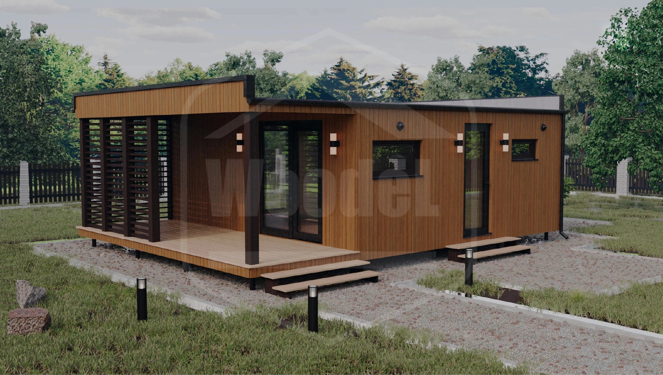 - Внешняя отделка: Профилированный лист в стильном цвете «Графит» (или другой на выбор). Элементы фасада из планкена лиственницы.