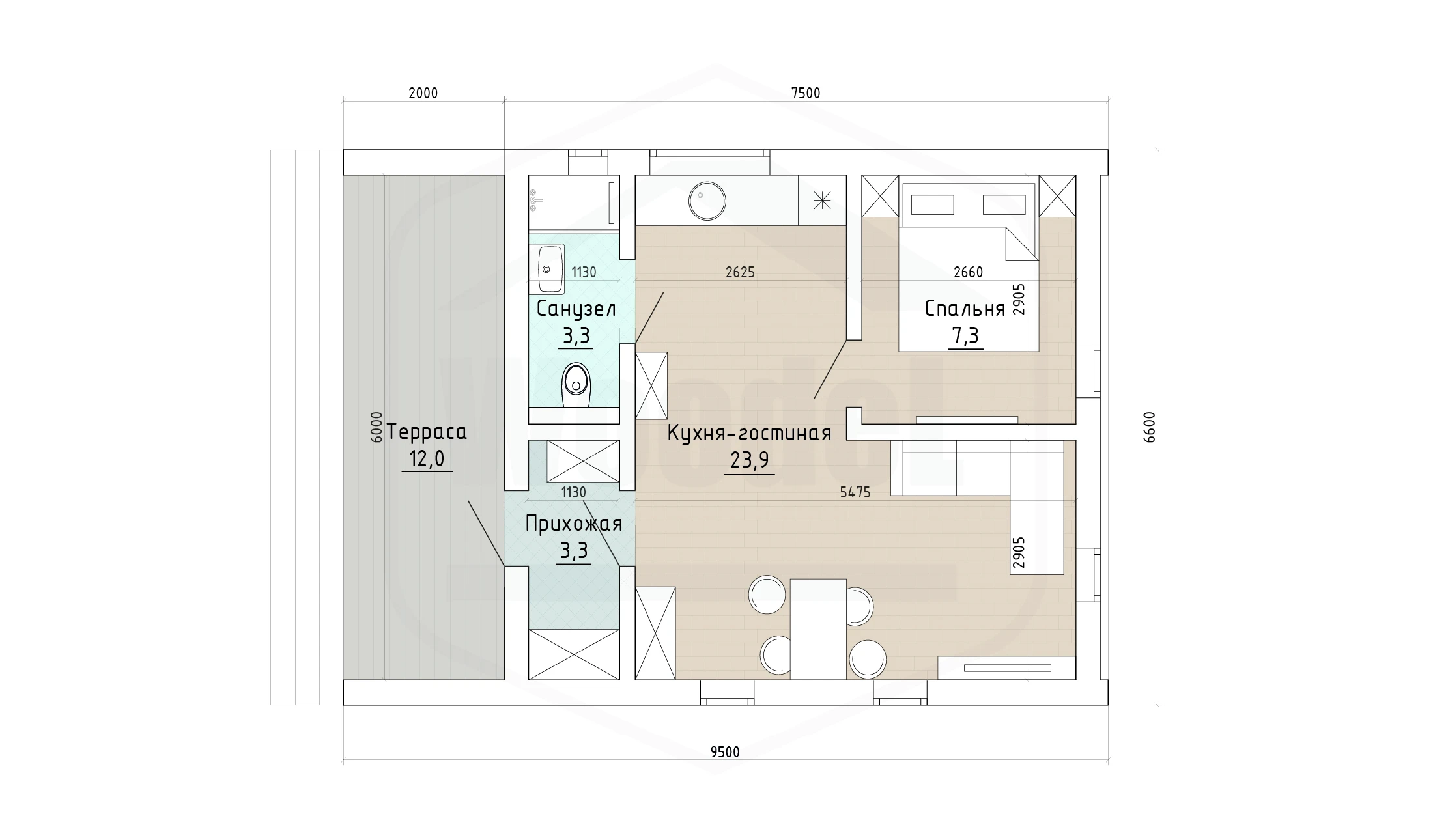 Одна спальная комната, просторная кухня-гостиная и ванная комната. Дом производится под ключ с электрикой, сантехникой, отопительными приборами, стильной внешней и внутренней отделкой.