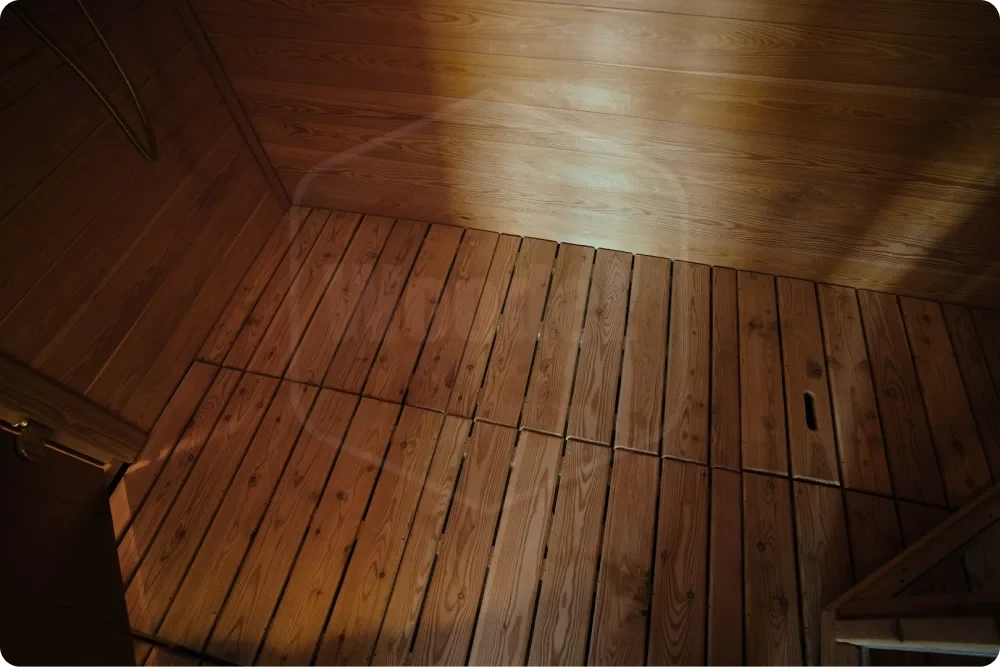 В помывочном отделении пол выполнен из оцинкованного листа (водоотлив), сверху на него в горизонт постелены трапы из дерева. Это позволяет выполнять легкую уборку помещения, сняв трапы и пролив всё водой. Данный вариант особенно удобен, когда баня изготовлена для коммерческого использования.