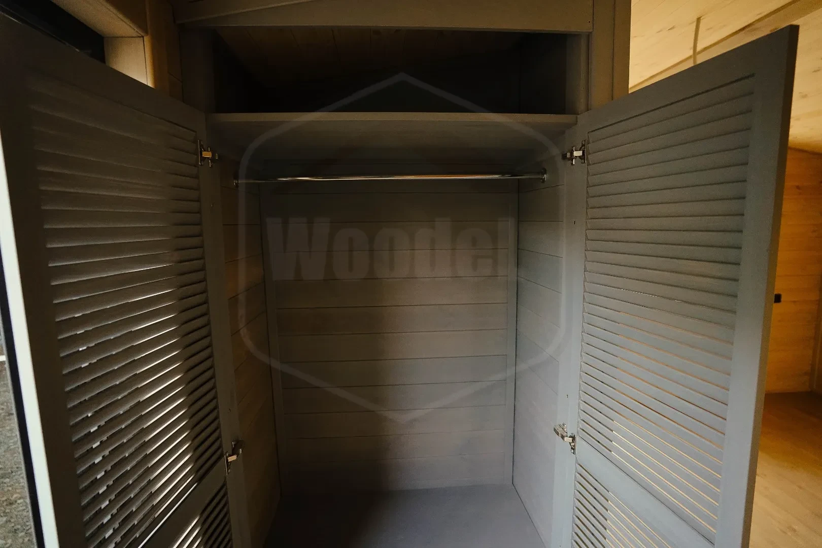 Отделка парного отделения выполнена кедровой вагонкой, а помывочное отделение лиственницей. В районе установки печи проложено несколько слоев огнеупорного материала.