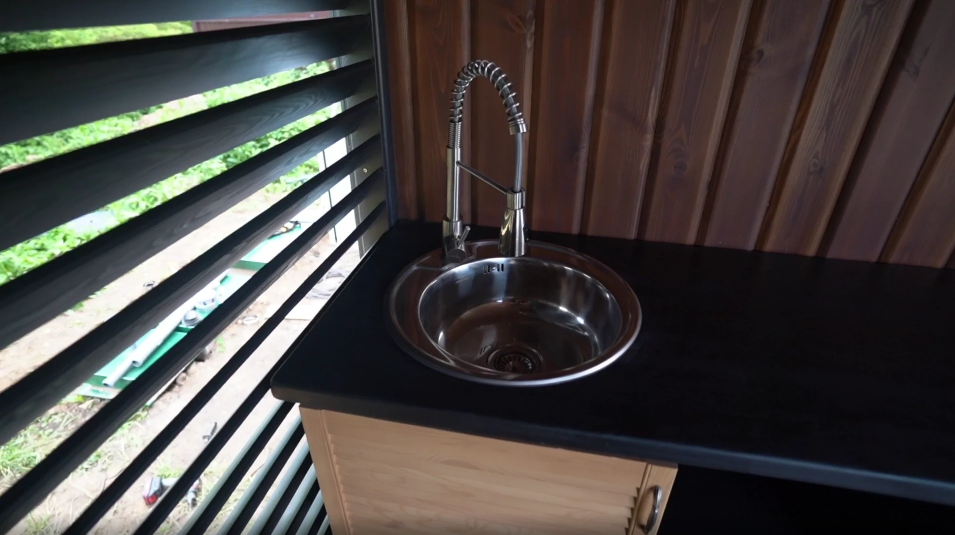 В беседке проведено освещение и вода. В веранде представленно два типа жалюзийных стен: открывающиеся и стационарные