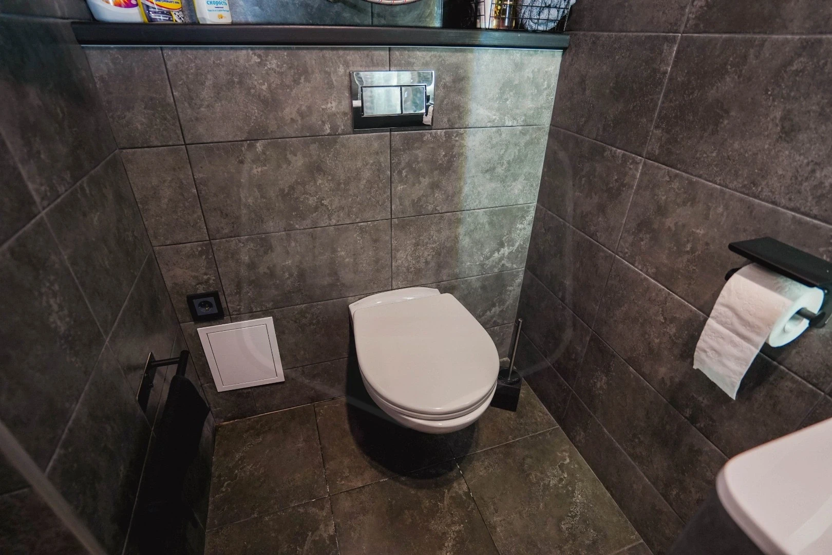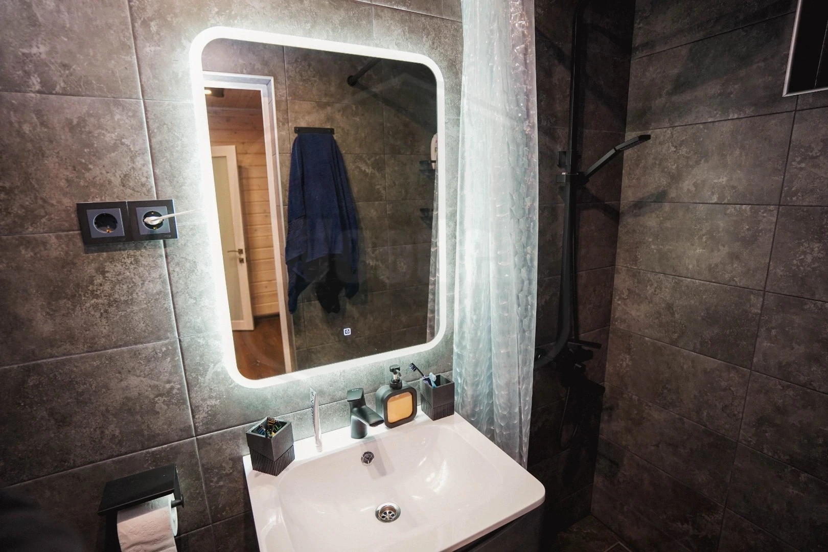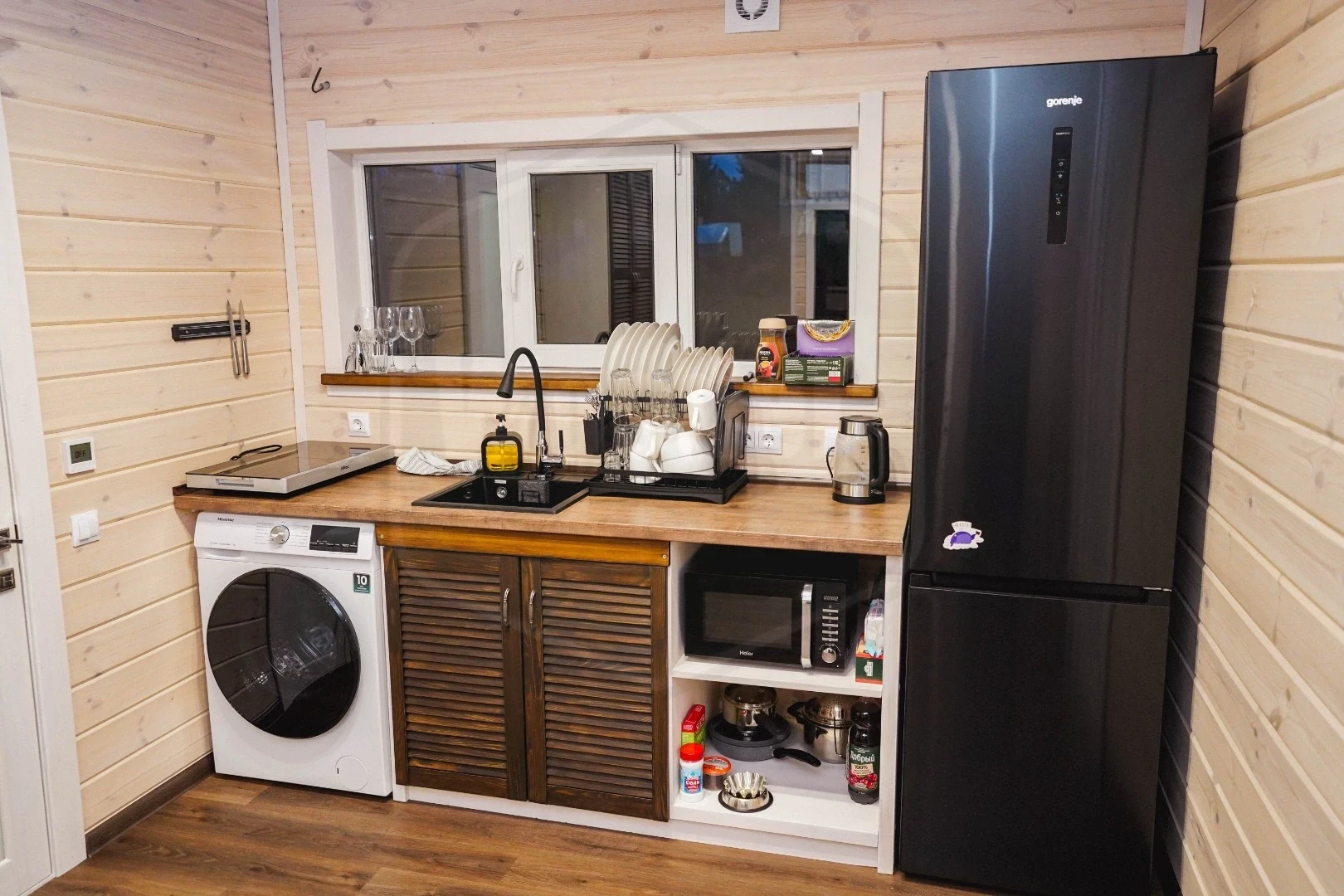 Санузел выполнен в едином стиле с домом: стены обшиты светлым деревом, что создаёт ощущение чистоты и тепла. Использована современная сантехника и фурнитура, предусмотрены удобные крючки и зоны хранения, чтобы всё необходимое было под рукой.